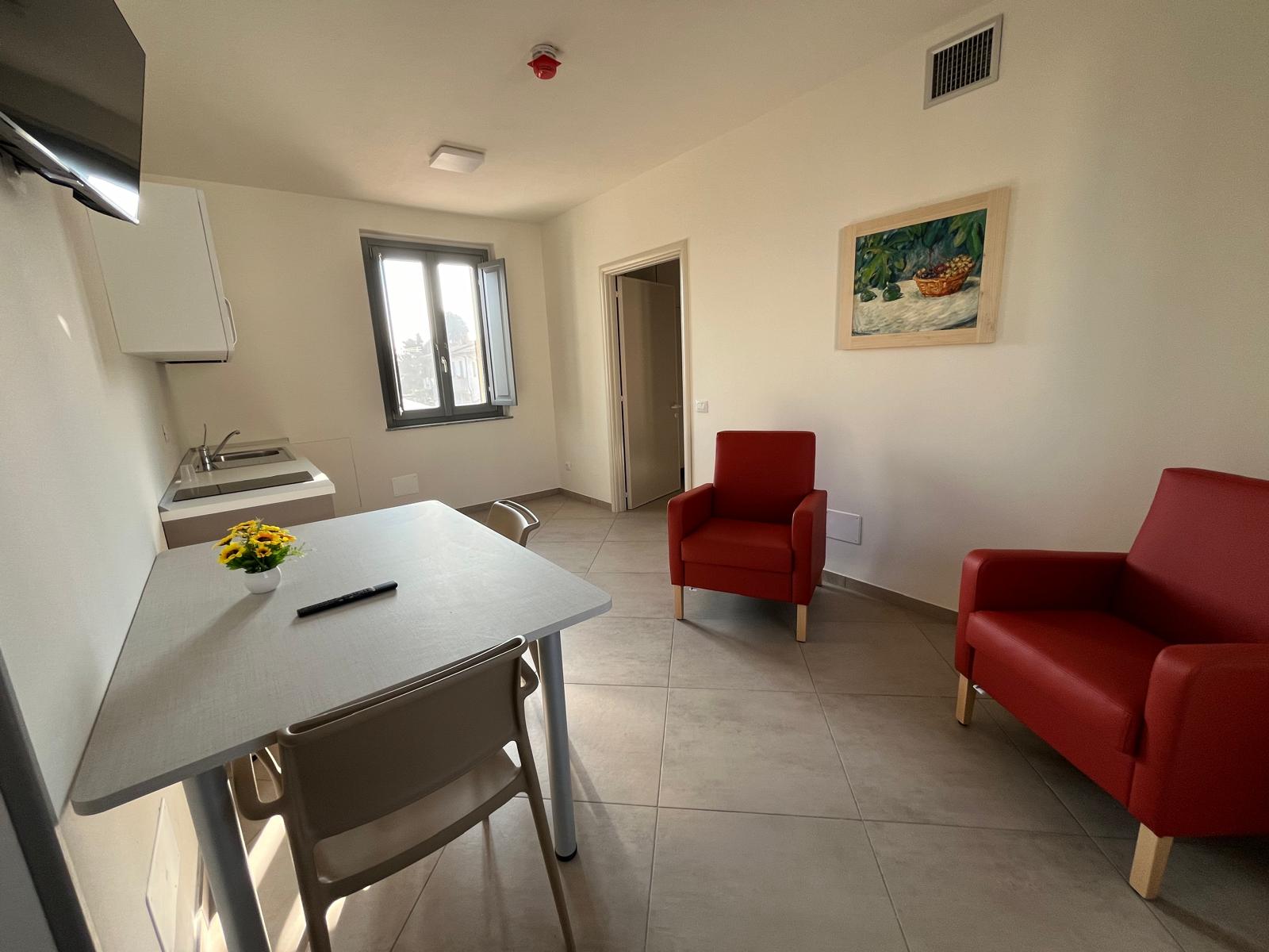 Tutti gli appartamenti sono classificabili come bilocali, hanno una superficie di circa 43/45 mq ciascuno, sono dotati di soggiorno, angolo cottura, camera da letto e bagno ad uso esclusivo; quattro di essi si avvalgono anche di terrazzo mansardato. Per ragioni di maggiore sicurezza questo Ente ha provveduto ad installare anche nei bagni degli alloggi appositi maniglioni. Tutti i pavimenti degli alloggi sono realizzati in materiale legnoso, con caratteristiche estetiche tali da favorire la connotazione residenziale dell’alloggio. Gli arredi, pur conservando un aspetto decorativo assolutamente coerente con la tipologia della struttura, hanno caratteristiche antinfortunistiche, di sicurezza e di ergonomicità da risultare adeguati alle esigenze dei Signori Ospiti Utenti.